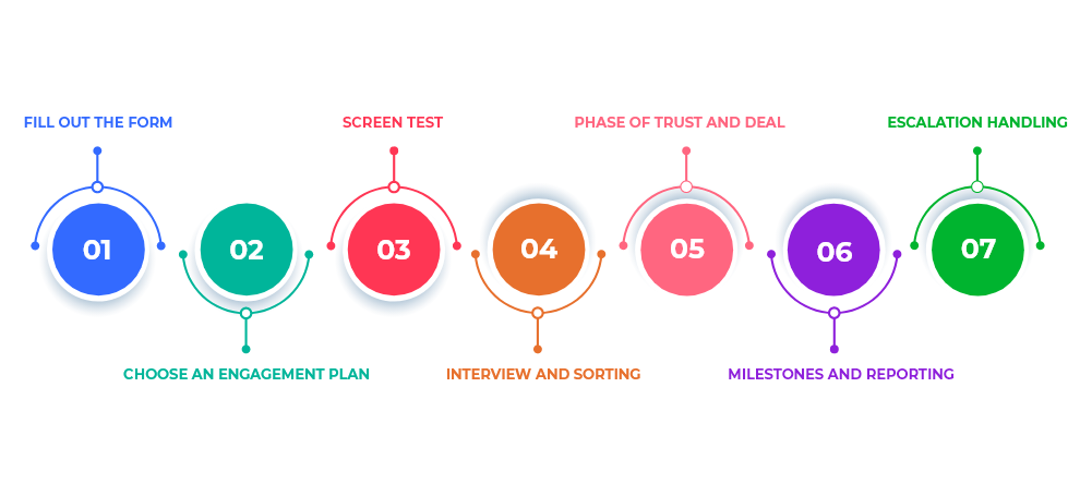 At SKYlinkdeveloper, you just have to follow 7 easy steps to hire developers. We employ a free-flowing process that assists the client in understanding everything regarding hiring dedicated developers and making informed decisions.